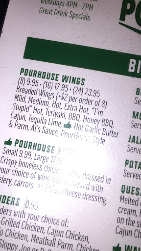 A great place to come for food and drinks. Excellent atmosphere and helpful staff. The drinks are good and the food comes in very heafty serving sizes. I usually come here either for the wings or burgers. If you like wings, try their hot garlic butter flavored wing sauce. Very tasty. If youre Im the mood for a burger, all of their selections are good amd you can build your own, but I recommend their signature pourhouse burger. It is definitely a great burger. Always look forward to a good time at this place