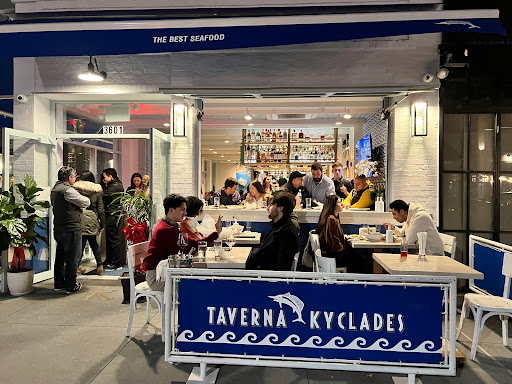 Great food. Went on a Friday at prime time and somehow we lucked out - no one was listening when they called for 2 people and the wife and I got a seat in less than 5 mins! Loved the salad, the unlimited bread and olive oil are really tasty. Wine choices arent great, but the food makes up for it. The octopus is phenomenal, its not easy to cook these things without undercooking or making them rubbery - Kyclades has it down pat. We shared the special mixed seafood platter - probably would have done better with a dish that featured a single item, but wanted to sample everything. Platter was very good - but the fish at the next table was really tempting. The free dessert at the end was a nice bonus - although that also made it clear it was time to go - others were waiting! If you like greek seafood and dont mind a bustling atmosphere, this place is an excellent choice.