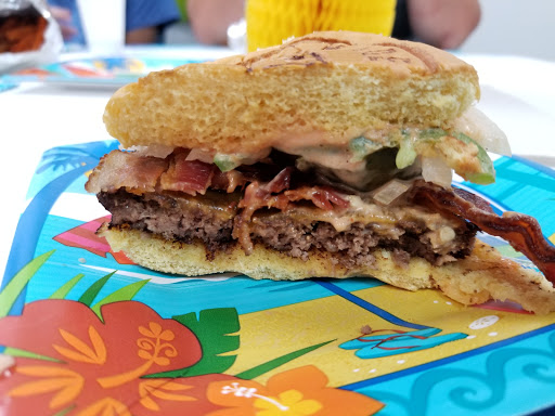 Great burgers for amazing prices, Ive been here about 5 times and this is the best local place foe burgers. This time i had the Atomic burger and my fiance had the Blue Ribbon burger. The Blue Ribbon was creamy, salty and delicious, the few bites i had left me wanting more. The Atomic burger at first didnt really seem spicy to me ( i love spicy food ) but by time i finished half of it i found myself searching frantically for my organic G&T. The atmosphere is relaxed and rustic, the music was perfect for us, a mix of 90s muisc for me and Ed sheran and Bruno mars for her. Our server was awesome, i dont remember his name but he was helpful and really funny and made our daughter laugh alot. If youre in the mood for a burger and want something that will taste good AND leave you coming back for more, this is the place for you. This is now our burger place.
