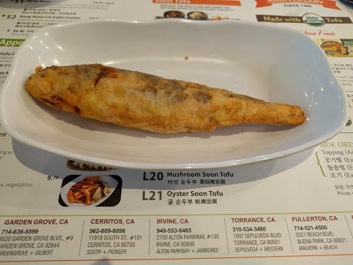 I came here this past Sunday, July 24, 2016 with bff Jenifa!. We shared a tofu appetizer that was stuffed with beef and veggies and drizzled with what seemed like a honey mustard sauce. It was delicious! The surprise, was that they make their own tofu. It makes sense, being that nearly every dish is comprised of it. We also had barley tea and the refills on the water was decent too. For our main dishes, I had the regular spicy beef soondubu and Jenifa! had the mild beef soondubu. The dishes we ordered came with a variety of sides. I really only liked the seaweed and the broccoli sides. The others were not my cup of tea or I couldnt eat due to dietary restrictions. They do start you out with a fried fish. The bones are a little tricky to work with. The head of the fish is fishier than the tail of the fish. I wasnt loving the fish, and it was a bit uncomfortable for me to eat like a chicken wing, but with chopsticks. The utensils were chopsticks and a long spoon, all of which were some kind of metal. I am familiar with using chopsticks, but these were too sleek and thin, and after breaking apart the greasy fish with my bare hands, it was even tougher to use the chopsticks; slipping and sliding through my fingers. Jenifa! offered to ask for a fork for me, but I forbid eating with non-traditional utensils at authentic places. According to Jenifa! this place is serving true Korean food. The regular spicy beef soondubu was delicious and the amount of spice was just right! Mine was more orange/red than Jenifa!s because she prefers less spicy. The primary ingredients are tofu, beef, egg (which you crack into it and mash around to let it cook), pepper flakes, and red pepper. The egg is cool and fun to do, but the dish it comes in is too light to crack it on. I didnt want to risk burning myself or getting any eggshell into my beef soondubu, so I attempted to crack the egg on the plastic bowl it comes in. Definitely need to hold the bowl with one hand as you crack your egg. Secondly, I disliked the fact that the egg managed to get all over my hands, and with concerns for salmonella or tainted hands for eating, there was nothing to clean up with. I used my napkin, but then I was napkinless until we were able to request some more. Any server or worker there can assist with whatever Qs you have, which is nice. It would be great if they could provide some sort of wipe along with the raw eggs, to keep the eating area and ones hands clean, just in case. The decor is simple and unique. They decorated an area with the dolsot bowls to create an almost-barrier between the dining area and the utilitarian areas (bathrooms/kitchen). I noticed on our way out that there was a downstairs area, but didnt see any signage as to whether it was additional seating or something else. The bathrooms are nicely designed and decent/well kept. Overall, everything was delicious and we probably ate more than we should have, but we skipped bfast for morning yoga prior to, so that evens it all out! :) Definitely go with friends so you can share the dishes! Happy eats!