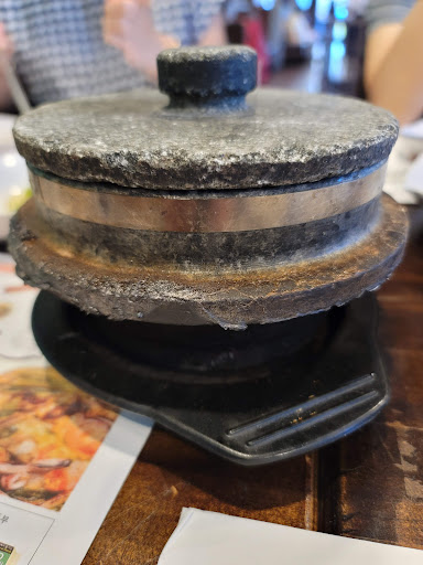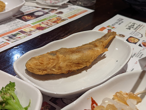 Soft tofu with your choice of spice level and a bit of you chosen meat. Foods overall are light and clean tasting; not heavy on the meat. Food: - Gu Jul Pan appetizer - cold dish; Various veggies wrapped in rice crepe; a bit on the blander side - Beef tofu soon tofu - Just a bit of scallion and some meat - Mix meat soo tofu - a clam, a mussel, a shrimp, and some bits of beef - Pajeon - Mostly scallion with only a few bits of octopus and shrimp - Dumplings - The thin skinned kind with I think pork and chives. Similar to homemade Chinese dumplings. Pretty good. Ban Chan: - Macaroni salad with egg and ham - Pickle slices - seem like regular american pickles, a bit on the light side of sour - Octopus in spice paste with radish - okay - Dried shrimp and peppers - the shrimp was tasty - Kimchi - good Also fried fish starter for every one. Very tasty. Burnt rice porridge towards the middle/end. Also tasty Ambiance: - fairly large place - quick service - there is a little play room for children