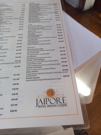 Jaipore is set in a historic 1856 mansion. Good food, good service. A lively crowd on a Saturday night made Jaipore a bit louder than usual. Hardwood floors and very little fabric makes the sound resonate. Maybe some music in the background would have calmed the tone. The menu seemed redesigned, and perhaps too complicated. Perhaps emphasizing "this is Martha Stewarts favorite dish" is a little over the top as well. Many diners, including we, were surprised that Jaipore no longer serves basmati rice with an entree unless you pay a la carte for it. We love the rice, but passed on paying extra for it. The food is well spiced, and very tasty. Refills on the water were both prompt and very necessary - this is Indian cuisine, after all. The rolling cart that serves each meal seemed a bit extreme, and noisy; maybe it is on purpose. A lovely place to have a good Indian meal. $54 for two, including tip (not including alcohol).