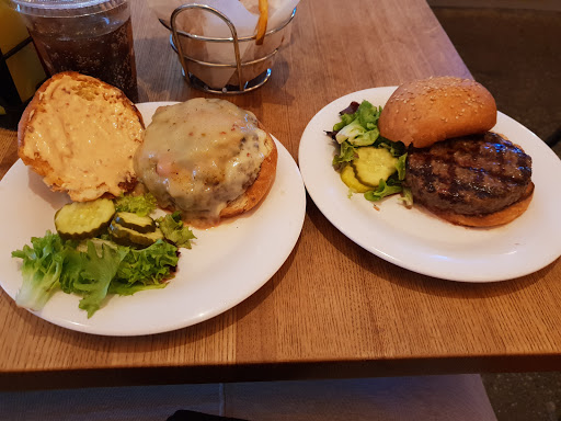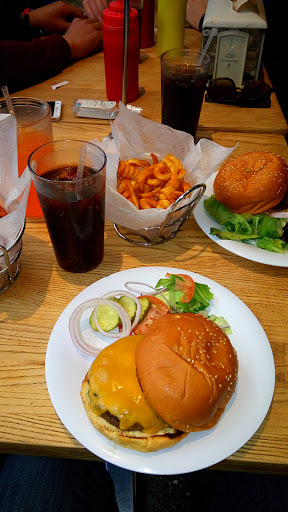 I got the Cajun chicken burger. It came our dry, 2 and a half small pieces of chicken. Two slices of pickles and two of tomato in plate. Chicken was chewy. Served by 3 different people, still had to get the water and root beer myself. The milkshake is basically ice cream in a cup, can suck with a straw, need a spoon and a fork for my partners meal. Which we didnt have at the table. Food is meh, service is lacking, still too pricy.