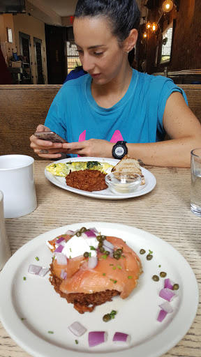 Difficile de trouver un endroit sympa à Brooklyn pour prendre son petit déjeuner avant 10h. Alchemy a cet immense avantage dêtre ouvert dès 9h (bon cest déjà un peu tard mais encore jouable) Lendroit est calme, désertique à 9h puis se remplit doucement à partir de 9h30. Un énorme bar nous montre bien que le soir, on ne boit pas que de la grenadine, il y a donc différentes ambiances en fonction des moments de la journée. La carte du petit-déjeuner est appétissante. Je commande sans hésiter le Swiss Breakfast : le fameux rosti de pommes de terres si connu en Suisse, oeuf mollet, saumon fumé, crème fraiche, câpres et oignons rouges. Avec un café, je me régale pour un prix nettement inférieur à Manhattan. Si vous êtes à Brooklyn et que vous cherchez un endroit pour petit déjeuner avant 10h, alors nhésitez pas à vous rendre à lAlchemy, vous me remercierez.