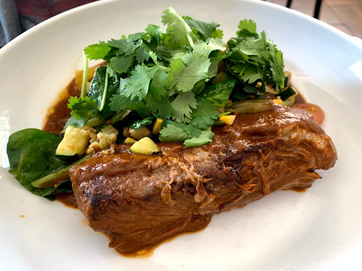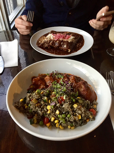Maybe ordered wrong, but not that impressed. As an app I had the tamale with chorizo and mussels. Frankly the only tamale Ive ever really enjoyed was from a woman with a street cart in Queens who made her tamales with lots of lard, so that the tamale was smooth and rich tasting. This tamale was moist and came in a sauce that would have been tasty if not for the fact that the mussels added a fishy taste. For the main I had the chicken enchiladas with mole sauce: dry shredded chicken that didnt seem to have actually been cooked in the sauce (which could have used a bit of thickening) and tortillas with a gooey texture. Oh well.