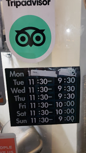 | Working: | 11:30AM–9:30PM 11:30AM–9:30PM 11:30AM–9:30PM 11:30AM–9:30PM 11:30AM–10PM 11:30AM–10PM 11:30AM–9PM |