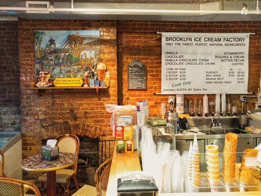 There are few things better on a warm summer day than walking on the Brooklyn Heights, going to Brooklyn Bridge Park, and then getting ice cream at the Brooklyn Ice Cream Factory. Beware the extremely long lines though. A way around the long lines is to get their ice cream from the outdoor vendor across from the building entrance. They have most of the selections youll find inside but they dont have the toppings, etc. But, saving 20 minutes in line makes this option well worth it. The ice cream is excellent. Definitely on par with Ample Hills.