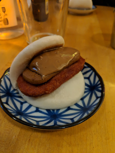The Buns I sampled were amazing! The ones I tried were 1. Crispy tofu shiitake 2. Artichoke 3. Pork jowl 4. Crispy fried chicken The crispy tofu with shiitake was amazing. Lots of flavor bordering on the sweeter side. It was a delicious bun when paired with my ommegang witte. The artichoke. Let me first say that I am a carnivore. Vegetarian dishes better have a wow factor because as a veracious meat eater I have a pretty high standard (must contain meat protein). Let me further say that this was my number two pick out of all the buns. Incredible flavor. Super savory with a hint of pickling. Fantastic bun, the sauce used seemed like a chipotle style aioli. The pork jowl. Obviously this was the creme de la creme. Flavor. Smokiness, juicy, tender, simply amazing. I will be back for more of these. Hopefully this place is like White Castle and you can order a crave case of them. Crispy fried chicken. While enticing I found the chicken a bit under seasoned. White meat dredged and fried lacked some seasoning other than the sauce and the toppings inside the bun. I would most certainly eat this again if placed in front of me but I wouldnt make the hike just for this specific bun. I tried the kimchi back. Its a shot of Jameson followed by a chaser of kimchi juice. Dont knock it. I know it sounds insane. But it was DELICIOUS!!! Im not a Jameson fan by any means but this chaser made it incredibly smooth and I wanted another. I didnt get to sample the pork fat edamame sadly I thought they were plain edamame until it was too late. I can only imagine how delicious they were. All the more reason to return for a complete meal. All together my experience was fantastic. A great neighborhood hideaway that you can easily miss unless youre looking for it. Come give this place a try. Youll love the food and drink.