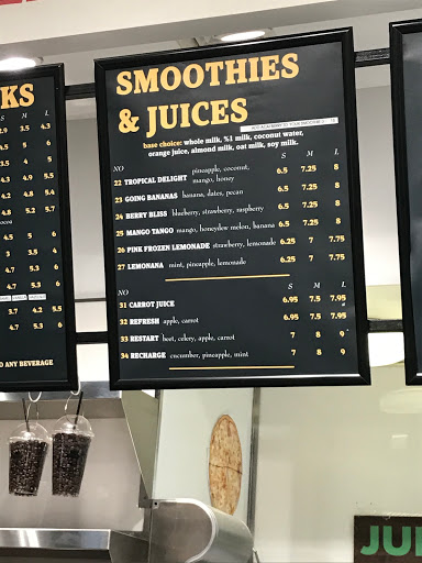 Great drinks and fresh salads! Theres room to sit indoors (high chairs) but i like sitting on the benches outside. Theres a lot of people in that area and lots of action there.
