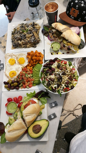 I love the sweet potato quinoa arugula salad that I can take to go. Also, great location right near the train. And free Wi-Fi is a bonus.