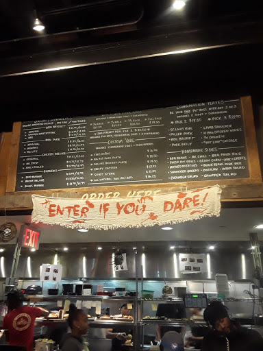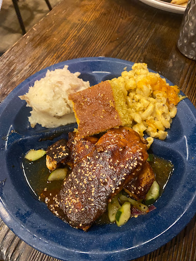 This place is very nice. The wait was a bit long but theres an option to grab a drink by the bar and it was very cozy. The bathrooms are great but it seems like they ran out of chalk so we couldnt contribute to the wall art which was a bit saddening. This place is great to take family, a hot date, friends, anyone really. The food was great. I would have given them five stars but our waiter was a bit rusty. I am a server too and I understand how hectic it can be but he was just clueless and VERY forgetful. Our appetizers came out with our meals. He put our order wrong in the POS system, obviously, and then blamed in on the kitchen. And he forgot to get us the sauce and corn bread that comes with platters. We also asked him for a bucket to put rib/chicken bones in and he apologized, wandered off, and never came back with a bucket. Then, on our way out we gave him a warm goodbye and his goodbye was cold enough to scratch your head in confusion. Otherwise, this place is great! I can not wait to come back when theres live music! The food was very satisfying except for the mac and cheese but everything else made up for it.