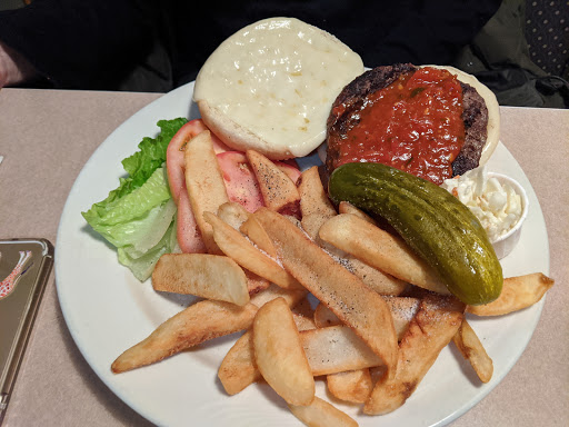 Place was outdated but the service was good. Theyre open all night and at 2 a.m. its the only place open. If you go here expecting gourmet food youre not going to get it, but I ordered a bacon cheeseburger and curly fries with cheddar cheese and it definitely hit the spot. Patty was juicy and bacon was tasty, curly fries on point. Has way too big of a menu with half of it probably not being very good but if you know what to order and what to expect I think youll come out all right. Stick with the classics...