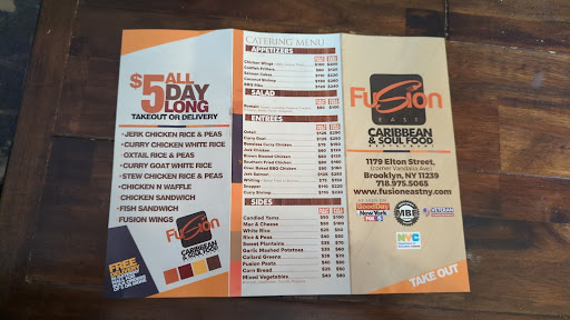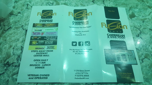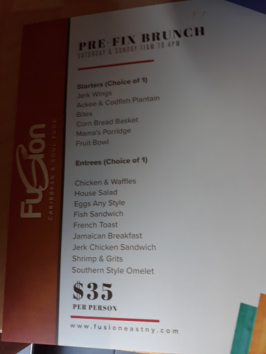 Fusion East is fine dining, Caribbean/southern American food. There is good tasty food, cooked well, served hot and fresh, with good service, a beautiful ambience and a very helpful, courteous and attentive staff at Fusion East. They also have live entertainment some nights and as the sun goes down, you experience a more romantic or electric type of lighting depending on the entertainment for the night. Come with your significant other, by your self, or with a group and youll still feel right at home. I also saw a couple families with children there too. Youll experience the love, and taste the fusion of good Caribbean, American cooking. This restaurant was featured on Fox 5 News, and after the anchors tasted the food on air, and made plans to visit, I just had to try it too; so for my birthday when my friend asked me where I wanted to go in all of NYC, I chose to go to Fusion East on Elton Street, in Brooklyn - right behind the new Gateway mall. I was not disappointed at all. I had a really great time! I had the coconut shrimp as my appetizer, and that was not finger wiping good, but finger-licking good. I had the stewed red snapper with rice and peas, and my friend and I ate from each others plate, so I also tasted the jerk salmon and mashed potatoes. They both came with a side of steamed vegetables. Both were delicious! Another friend joined us after our appetizer, so I had a fusion of good food, good friends, good service and good music. My pallet was dancing to the taste of the food, while my feet were tapping to the beat of the music. No reservation needed, at least we didnt make one. This is the best Caribbean American restaurants Ive been to in NY. Actually, in my travels to LA, OH, PA, GA and many other states - it tops my list. I was very impressed. I plan to be back very soon, but until then, I hope the owner is planning to spread his wings to other states and cities. I was too busy having fun and eating, and I forgot to take pictures of the dishes before we bagan eating.