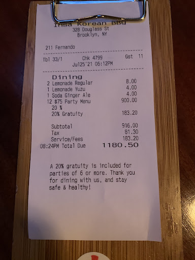 We have never been disappointed with the quality of service that we have received here. The drinks and food are priced fairly for the quality, and everything weve had is amazing. The sengsun gui and the tteokbokki are two of our personal favorites! At first, we didnt like the 20% fee and no tipping policy, but we have grown to appreciate it and like I said, there are few other places where we get as routinely great service!