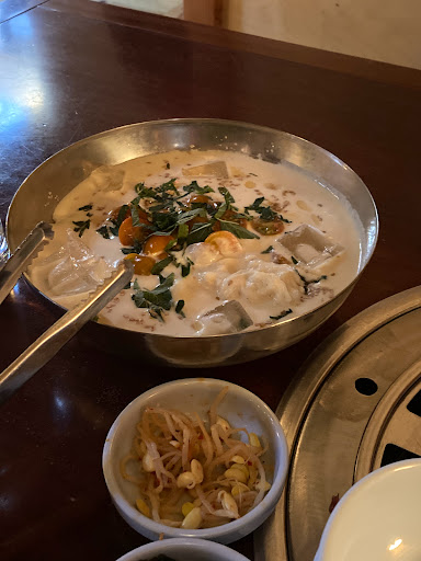 There is a lot of wood, and curves. The food is hot and its fun and the burner is right there in the table, dont touch it, use the tongs or your chop sticks. V friendly staff and many attractive people dining in this place. Attractive people looking at you warmly, momentarily, unassumingly, from several tables away. Theres karaoke in the back. Rosanna is my safety. Night moves is my reach. Restrooms are clean and private.
