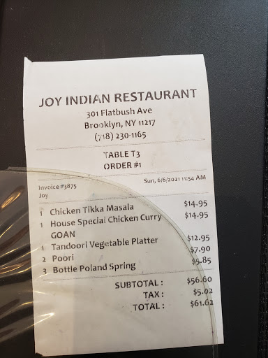My friends sister birthday request was for an Indian restaurant. Of course, my usual selection would probably be in the Curry Hill area on the East side but we were in Brooklyn. Prospect Heights to be exact and unfamiliar territory. We found Joy along the busy corridor of Flatbush Ave with lots of happy eaters inside so decided to give Joy a try. The casual restaurant but plain decor was an open room with tables and a small bar in the back. The restaurant was quite full and they politely asked two of the patrons if they would mind moving to a two top table for our group of six. The couple didnt have any issues and we graciously thank them. The menu had the usual selection of popular Indian selections and some that I havent seen before therefore it is an automatic must try. The table ordered some usual favorites and some new like Samosas to start and Chicken Tikka Masala, Gobi Bhajee, Saag Paneer and Shagoti with lamb. Samosas was crispy without being to oily. Plenty of flavor and a slight heat afterwards. The Tikka Masala was a bit sweeter than Im use to with a tangy tomato sauce. I always enjoy the Gobi(Cauliflower). I think the standout of the dishes was the Shagoti which the table agreed was very good. It had a slight heat, the lamb was tender and not gamey. The sauce was great not only for mopping but with the rice. The portions we thought was a bit on a smallish side but was still more than adequate for the table. I think if we were a bit hungrier wed need to add one additional dish. I think when in the area this certainly will satisfy anyone craving Indian cuisine without taking the 5 train to the city. Joy Indian left us happy and ready for some after dinner fun in the neighborhood.