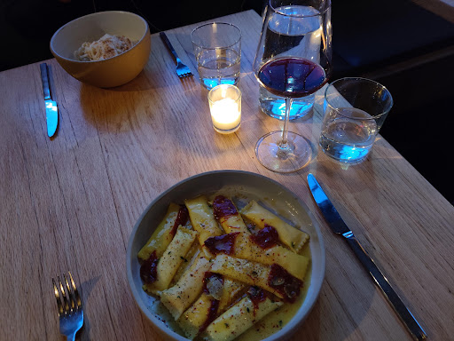 The food was fantastic, if a little heavy on pepper and chile, and the music was good. The design of the restaurant was nice. But the service was an issue. We had no reservation and were told it would be an hour and a half wait, unless we wanted to eat out on the patio. We opted to wait in the cafe area until a table inside was available. In the cafe, they gave us a water and we also ordered coffees, and an ice cream, specifically saying we did not want the ice cream until we finished the coffee. But the ice cream was served with the coffee. And yes, they were busy in the cafe area, but they completely ignored us after that. Sitting around waiting, youd think they would ask if you wanted something else, maybe even another glass of water. Whatever. The wait ended up being only 60 minutes or so, so that was good. They called us to the front and asked us again if we wanted the patio. We had to keep waiting for a few minutes for a table. Then when we were ordering food, the waiter insisted on taking a full order up front, not just apps. It felt like we were being strong-armed into ordering, and inflating the bill. And we should share all plates. Meh. It was a very good thing the food was so delicious. Loved the prosciutto with balsamic mustard and parmigiano butter, and the mozzarella toast. Loved my angnolotti. The strawberry crostata Was delicious as well. But this is the thing: Italian food isnt overly spicy. The menu was heavy on descriptions of chile or fresh pepper or peppercorns being in almost every dish. A lot of Italians I know will remove garlic from the pan before finishing a pasta sauce. Italian food is a lot more delicate than what was on the menu - Italians would add herbs like rosemary, mint, basil or sage to a dish before chile. I dont know. Maybe management isnt going for authenticity. Other than that, Italian food isnt supposed to be shared like tapas. Were they trying to encourage we eat "family style?" I dunno, that seems a little strange. Like I said, what we ordered was absolutely delicious, but that took a careful look at the menu. The bathroom needed more attention. There were no hand towels when I went in, and the (small) trash can was full. I went a second time, and the trash can was overflowing. Then, my dining partner needed to ask for TP. Details like that count when you go out. The restaurant is situated at the crossroads of some of the most hideous new apartment buildings Ive ever seen. Felt like we were in White Plains, not Brooklyn. Awful and depressing. They initially wanted us to eat outdoors on their patio, but that was no going to happen.