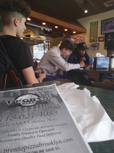 My family was born and raised in Brooklyn. We are ALL foodies. Ive moved away from NYC and when my family visits, we make it a point to eat Prontos. We always get some penna ala vodka pizza along with regular slices. We also occasionally order zeppoli which, the last time we were there, was not on the menu [add nutella to the zeppoli for an even sweeter treat]. The staff is always more than friendly, even when it is madcap busy. When we have non New Yorkers along with us in NY, this is where we take them for pizza.