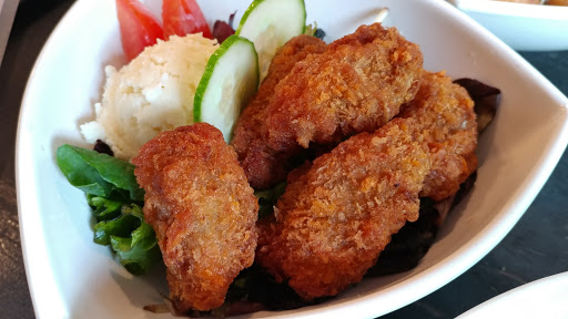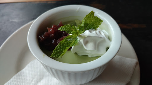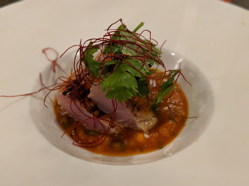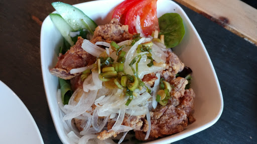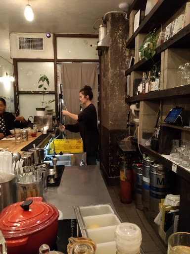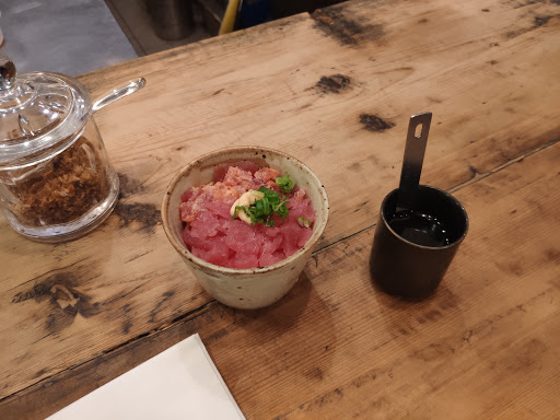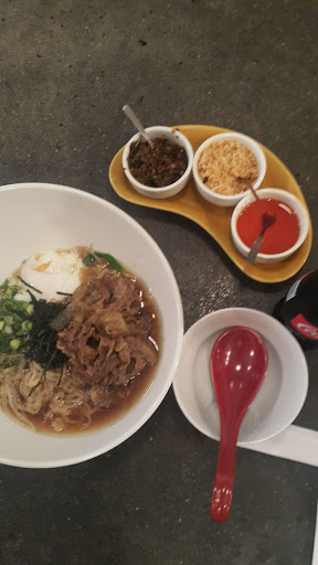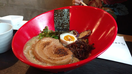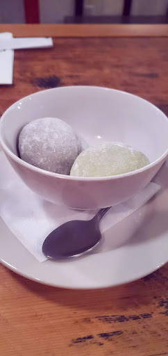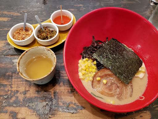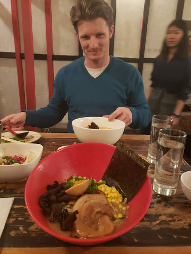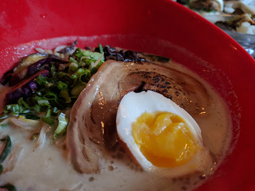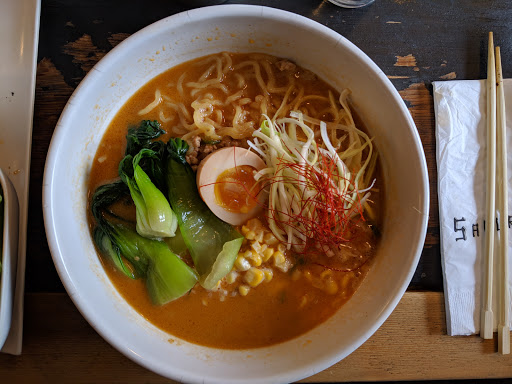 I happened to be in the neighborhood, and the internet came through with this suggestion. This is primarily a ramen and sushi place, which was perfect for the cold night. I got the chicken broth with chicken instead of pork, and my friend had the vegan ramen. They each come with extra broth, the meat with bonito broth and the vegan with a side of vegan broth. The ramen was thick and flavorful, with a very generous serving of noodles. I ordered what they call a shot of sushi, although they misunderstood and rough me a salad, and I didnt know what I was supposed to be getting, so we ended up with both. The tuns was good quality. The shot had some sort of flavoring that really enhanced it. The adegashi tofu appetizer was good, nothing out of the ordinary. We also got hot tea, which was of good quality and appeared to be real powdered green tea served in a handled mason jar. The service was great, very friendly and attentive and helpful but not at all overly attentive or rushing. Its a nice simple space with shared tables--a counter, a round table, and the bar. Theres one bathroom.