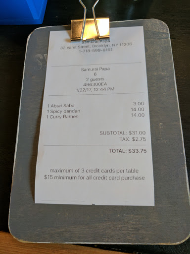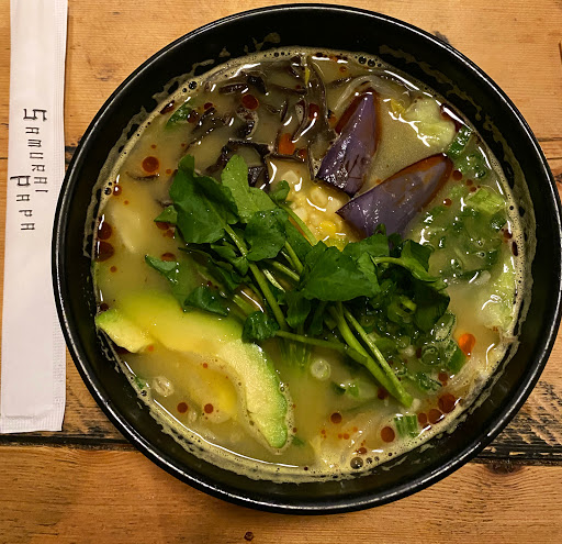 I ordered the curry ramen which came with pork, a half an egg and some vegetables. This was a to go order so the ramen came in 3 separate containers that you had to put together to make the bowl of ramen. There was a bowl with the solid ingredients, a bowl with the curry broth and a bowl with some clear liquid(water? im unsure).The problem is there was no instruction on how to put it all together. when I was done assembling the ramen it came out pretty watery. something tells me that the clear liquid was not supposed to be added to the ramen. while the ramen was pretty tasty I think it was watered down and the broth should have been more flavorful. Im giving samurai Papa 3.5 stars. Had I eaten in the restaurant I think it would have been better because It qould have been prepared correctly. I dont think what I ate was how they intended the dish to be. Ive had more tastier ramens in various ramen spots in NYC but im still unsure if i got the full flavor at Samurai. Im not opposed to trying them again and if i do ill dine in and adjust the rating accordingly.