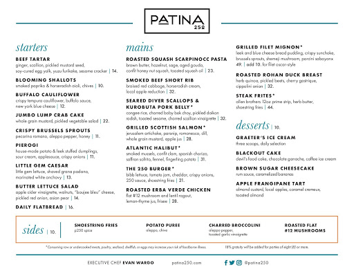 My family and I dined at Patina 250 for my birthday and it was definitely the right choice. The service was exceptional and our server Joshua, made the night extra special. He was attentive to us all and wonderfully patient when answering my dads many questions (the folks dont leave the burbs too much). The restaurant clearly prides itself on its table service and works to set itself apart from other dining experiences, an endeavour it succeeds in on every level. My entire party of 6 felt personally taken care of and special. The icing on the cake was when Josh brought out a separate piece of cake for me with a candle in it in addition to the other desserts wed ordered despite no one specifically saying it was my birthday (the presents were a pretty big give away). I highly recommend this restaurant.