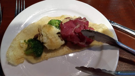 Like fondue but with solid cheese. You pick the cheese and other ingredients and melt the cheese under the broiler at your table and make your own crepe. Fresh, tasty and fun.