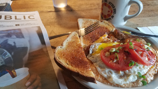 The overal atmosphere is great for an urban cafe. The food is mediocre at best though. Not sure if because of the new location and lack of organization. We dont mind a long wait for good food but what we got were plates of grease, dry avocado toast on the wrong bread (we got wheat, asked for white). The hash browns were as if they were soaked in oil. The coffee wasnt as good as we had anticipated. When asking for a knife, the chef appeared overwhelmed and said that none were clean at the moment and that he couldnt help us. At least the girl at the register was pleasant. I wouldnt recommend this place.