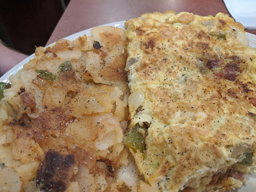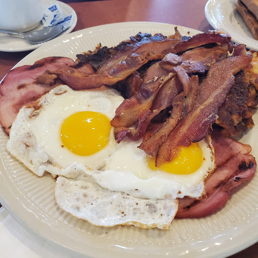 I brought my friend here for a birthday breakfast. He ordered blueberry pancakes eggs, bacon and hot chocolate. He enjoy his breakfast said the blueberry pancakes had plenty of blueberries. As for myself I had steak, eggs hash brown and tea and lemon. I enjoyed everything but the hash browns. Establishment very clean. Service was okay. Bathroom ok.... but could have been better