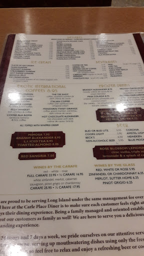 The Carle place diner is a cornerstone for society itself. Exceptional menu with enough choices that even your pickiest friends cant say theres nothing here I can eat, service that doesnt compare to anywhere else (like how my water is always full and I dont even see it happen), and of course delicious food. Coming here will change how you see diners as a whole; and put them all to a higher standard.
