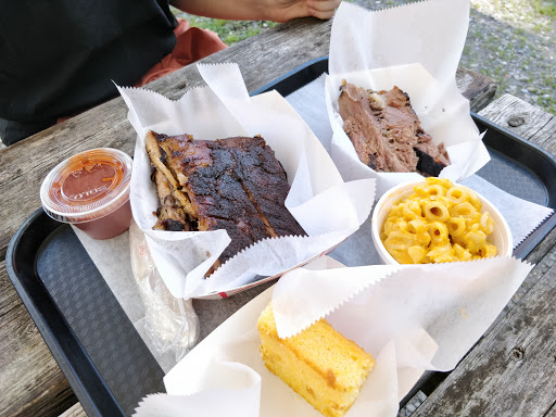 Bought the sampler, which came with Chicken, Brisket, choice of Sausage, and Ribs. Also included Jalapeno Mac and Cheese, as well as Potato Salad and Cole Slaw along with a piece of Corn Bread. The Brisket was absolutely the best meat on the menu, the side were good, the Corn Bread delicious (moist). BBQ sauce was tasty, have had better, but all of the food was legitimately barbequed, would recommend. Small spot, roughly 6-8 picnic tables indoors, all well equipped with sauces napkins and paper towels. Went late night near closing, lot of couples.