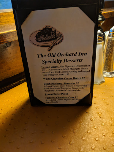 The Old Orchard did away with the famous cinnamon buns in the bread basket. The bread was boring white bread and not stale but old. Even tho the owner who made the cinnamon rolls died it should be a tribute to her. The chicken fricassee was delicious. The Mahi mahi with scallops were dry and fishy. The scallops were no bigger than a fingernail. The muddled old fashioned was $7 bucks. Perfect price for it. The scenery outside sitting was beautiful but they need some landscaping crew to clean it up a bit. Especially behind the tent. A little cleanup would go a long way. Service was slow. Good luck.