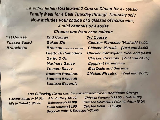 La Villini is an Italian restaurant that everyone needs to experience. Whether on a date night or with a group, your eyes and stomach will not be disappointed. Servers are extremely friendly and knowledgeable--so trust their judgement. The entire menu is enticing, but here are some favorites: calamari (with La Villini sauce), brushetta, blue cheese salad (served on chilled plates), penne ala vodka, sole, veal parmigiana, and be sure to order a Napoleon in advance. Enjoy!