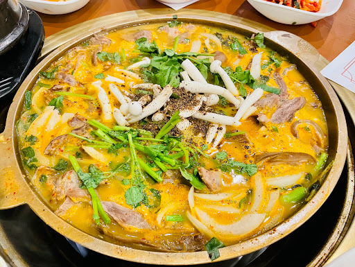 Went for the Korean BBQ cooked at your table by friendly smiling host ladies. Had pork belly, rib eye and especially duck. Also had a short rib and rice casserole, a squid plate and a big seafood pancake. The table was filled with dozens of vegetable and spice accompaniments like sea weed, peanuts with tiny anchovies, fish, tofu, bean paste, seaweed salad, of course Kim chi, plus dustings and sauces. Lots of fun to roll your meat in the greens, spice em up and bite. Favorite was the rib eye sliced thin and chopped - tender and flavorful. Similar for the duck. Pork belly was OK but Ive had better. Two of us loved the short rib rice casserole and two wished it had more meat. Most of us didnt like the squid so much, kind of spicy and chewy - next time Ill pick the octopus I think and stick with bbq. The egg seafood pancake was almost a meal alone: quite delicious. Also among the extras was an egg custard bowl almost dessert to offset the spices - great comfort food. So much fun - will go back for sure. The staff is just the best, they made us feel so comfortable. We appreciate that!