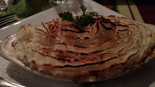 We found this place that is in a corner off Austin, away from the bustling area. We chose it because it had decent prices. The interior decor was cute, it felt very homey, and it really felt like your were in Ireland. The food was standard Irish fare, with big portions. Although it was busy, service was very good and the food came out at reasonable times. Irish beef stew- standard potluck beef with vegetables. It was pretty good, I especially liked the Guiness gravy. Gaelic steak with mushroom sauce- It was pretty big for a 6oz sirloin. I ordered it medium rare and it was probably medium and too overdone and tough for my liking. I kept biting into the hard fatty pieces because the lighting was so dim and the gravy was covering all of the steak. The mashed potatoes tasted like it was instant. french onion soup- I wasnt really impressed. It tasted like it was from a packet.