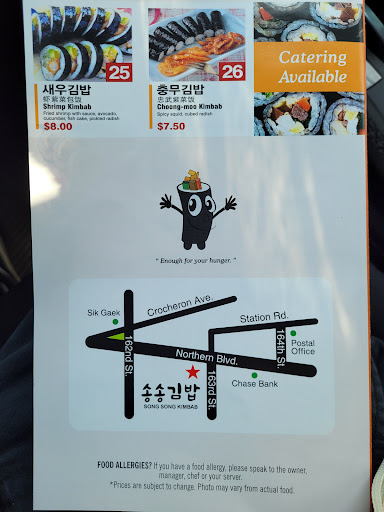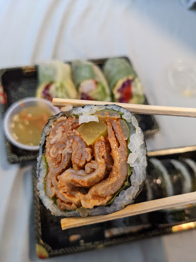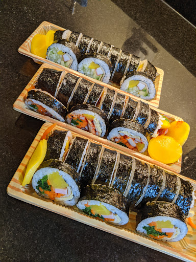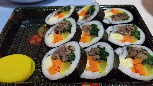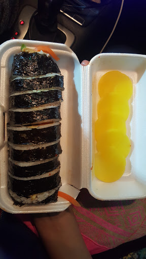 Kimbap. The korean sushi, love it. Ive been to both locations, this one and the one near Murray. Both places make great quality tasting Kimbap and is a great mid-day snack or even a post workout meal. The interior is bright because of the walls, and isnt a sit down eating place. Its more of a grab and go place. I would recommend anyone to come here for Kimbap. I am no expert nor am I someone who has eaten at many kimbap shops, but Songs really does make great Kimbap, at least I like it. If you need parking, their location has a tiny parking lot in front where you can order, and leave within 5 minutes.