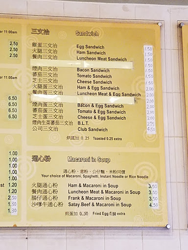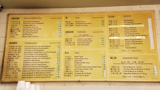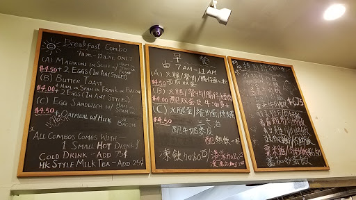 This review is for their breakfast! So this place is the go-to place if youre in the neighborhood and want a quick HK styled breakfast. There are different set meals and the price varies, but its around $4 or a little more depending if you want to substitute things. The meal that I usually get is either macaroni or instant noodles (has a lot of MSG in this one) with soup with ham, 2 sunny side eggs, and a drink! I actually like their milk tea, so I get that, but the coffee here is mehhhh...Ive also tried the oatmeal, condensed milk over toast, and the sandwiches which are also pretty solid!