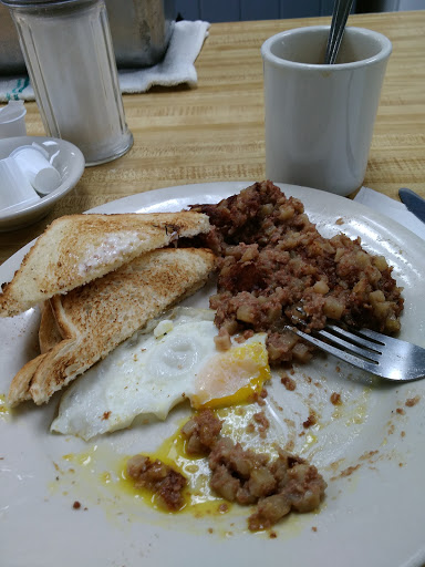 This is a terrific little local cafe with first-rate breakfast served until noon on Fridays. The hash browns, Italian toast, corned beef hash and over-easy eggs all were perfect 10s. Friendly, local customers, nice service, fluorescent lights (oh well)... we will be back...