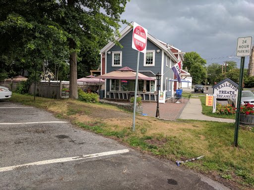 Trailside Treats Creamery is right where you need it to be. Located along the entrance and parking for Heritage Trail in Goshen, NY, this is conveniently found within walking distance of downtown Goshen village and the trailhead. Ice cream offerings are plentiful and the service is friendly at Trailside. There is comfortable seating available and additional shade provided by pop-up canopies and tents for patrons. There is good shade from the surrounding trees, as well. While there is good open space, this place does get crowded so dont be discouraged if the lines seem long... Dont worry: the staff moves quickly enough to get to you. Pups and dogs are also provided hospitality as there is a communal bowl with fresh water near the parking lot.