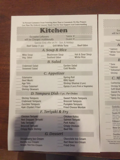 Not a bad All You Can Eat Japanese place in Great Neck. The sushi/sashimi generally tastes fresh, and they give you nice sized slices of fish. The other menu items are hit or miss, and sometimes indicating "one" on an item will get you one order consisting of 4 pieces of beef while another time youll get exactly one piece of beef. The service is not bad, although they dont seem to communicate with each other as someone will ask what you want to drink 10 seconds after another person just took your drink order. Id say its above average, hence the 4 stars, and I dont mind coming here fairly regularly.