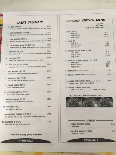 Koreana is a decent Korean restaurant. I prefer going to the Manhattan or Queens but when you have a craving this will do. The chicken is not consistent. At times its great and other times it could be much better.