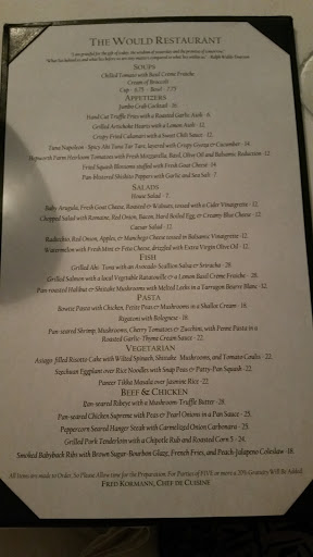 I havent been to the Would in years. Maybe its improved, but considering the prices Im not inclined to try it again. I took an out-of-town guest there long ago and she still recalls it as one of the worst restaurant meals she ever had. The food verged on inedible and the service as barely passable. The rather tough stake was overcooked and served with a disgustingly sweet sauce. Ugh! I still cringe with embarrassment when I thing of subjecting a dear friend to such awful food.