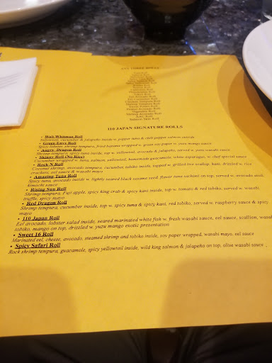 I scouted a place for myself, my wife and our son to eat. Something different. After reading all of the reviews we finally decided to give 110 Japan a try. The customer service was amazing. The second we walked in the door we were greeted. Another thing that I truely liked was dining hibachi style with a table full of other people dining as well. The fact that the chef was very involved with the crowd was amazing. Im sure all of the chefs here are great But Kevin really made everyones night enjoyable yesterday. The food was on point. The atmosphere was also great. Not sure why anyone would give a negative review. We laughed and enjoyed the time we spent with the whole table. It was as if we all made a plan to go there together. Absolutely something I would recommend to anyone else thinking about going. We WILL be back. Thank you for giving my family an outstanding first impression of your restaurant!