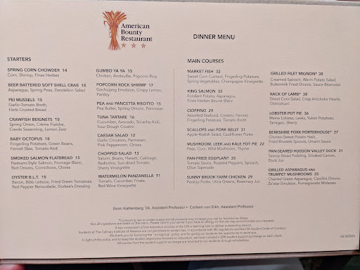 First of all, the food and service would be considered average to poor anywhere else; but come on folks. This is where we are training the next generation of culinary experts, for crying out loud. The school is backed by some of the best in the industry: Marriott and Hilton. You would honestly think that you are in for a real treat. Dont waste your time at this place. Seriously. Beautiful campus. Wonderful approach across a courtyard from the parking garage. Terrific "grand" entry point followed by an institutional grand hallway to the entrance....the magnificent and acclaimed AMERICAN BOUNTY. Then it was ALL down hill from there. Terrible greeting at the door (non-plus), wimpy service. Wait until you hear this, four separate servers asked for a pepper mill, two were reminded more than once that we still had not seen one. Someone finally brought one to the table just before dessert. Over cooked fish, tough steak with too much sauce. If this is the "next generation", better get your eating out experiences done now, it aint getting any better with this crowd. Please take a look at the photo of the dessert. What exactly is that? Disgusting is what it is. Asked to see a manager or someone with whom we could relate our concern. Once, twice...twenty minutes. Oh, the same process as the pepper mill. No one has heard of it, or in a fine dining restaurant where we train the best of the best, there isnt one. Never saw anyone that night, but got the business card of someone that we could follow up with. Left messages the following day and the day after that. Never got a response. And for all of this terribleness and lack of concern, they charge regular fine dining prices. Our dinner for four was $250 with tip. Did you know that that students at the CIA protested against the administration on 23 April 2013 (we were there last week). They are complaining that the school has dropped their standards. Now everything makes sense. Dont go....and dont be impressed by anyone who was trained there. Let the experience of dining out do the talking. Boy were we mad.