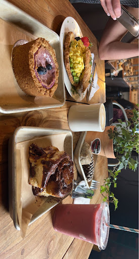 A lot of bakery choices, including a variety of gluten free products, good coffee, cozy atmosphere, very friendly host. You can sit in the bakery for a quick bite and a chat with friends or you can take away. One of the best challah Ive ever eaten.