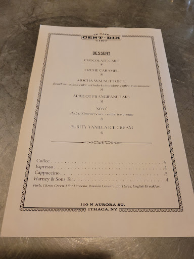 Cafe Cent-Dix is an excellent and authentic French bistro. They offer a wide selection of appetizers, a fairly short but well-diversified list of entrees, a heavenly dessert menu, and an extensive wine list with very good by-the-glass selections. All the food we ordered was superb, the service was very professional and the ambiance is cozy but elegant. A fine addition to Ithacas "restaurant row" and highly recommended.