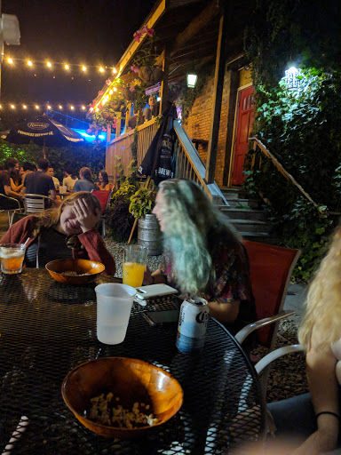 A casual hipster bar with tons of beers on tap (many local, some unusual), large outdoor seating area with a food truck sometimes there on select evenings. Free popcorn is the only solid food, otherwise, though there are good pizza, Vietnamese, and Chinese take out places within a block. Ive brought in take out food before and it wasnt a problem, just be considerate and clean up after yourself. They have a dart board, and cornhole out back. The crowd is a mix of grad students and locals who you might expect to find at the Farmers Market.