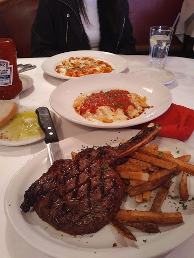 Meatball is amazing. Order two off the appetizer menu and theyre served in red sauce. Each is baseball sized with a great texture. Try it with the cheese. For dinner I went with the bone-in ribeye, cooked medium with a side of fries. It was cooked excellent, pink in the middle with a fantastic crust and plenty of juice. Service was a tad brusque. Took too long for drink refills and she did a poor job anticipating our needs.
