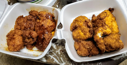 The wings were really good I had garlic and Parmesan and honey barbecue the fries could a used A creamy cheese sauce instead of actual cheese that they melted on it which made it clumpy that would be better and the garlic and Parmesan broccoli needed more garlic and Parmesan on it other than that I love their wings I would totally show them how to make the fries and the garlic Parmesan broccoli