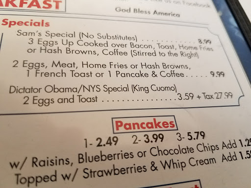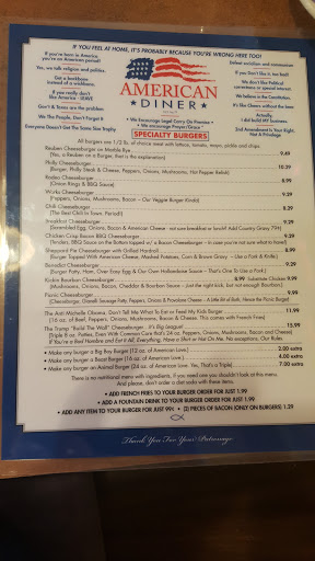 Food is good and reasonably priced, service is great. Political messages on the walls provided a welcome environment in a liberal stronghold like Syracuse. Nice to feel welcome and comfortable somewhere. In a city where the hospitals wont even offer the most popular Cable News Channel in the country - Fox News - for viewing in patient rooms, it takes guts to run a diner and not hide your views. God Bless the owner.