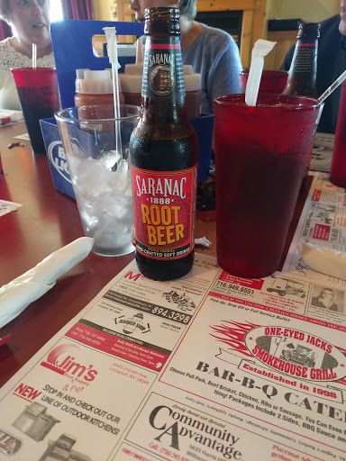We stayed in Lockport to travel to Niagara Falls. We found One Eyed Jacks on Yelp and it had good ratings. The place looked nice and we went for a late lunch so it wasnt very crowded, but still full. Ive tried lots of barbeque and I like the smoked, southern style, but its hard to find BBQ I love. This place was great! I tried their bbq feast which had ribs, chicken, pulled pork, brisket, garlic bread, and I had baked beans and coleslaw. The ribs and pulled pork were a little salty, but the flavor on everything was great! Light smoke flavor, not too heavy, no sauce (I asked for it on the side, I prefer dry BBQ so I can taste the meat). The ribs were meaty, I only threw out the bones, I didnt have any fat or gristle to set aside from it. The rib meat fell off the bone. For BBQ competitions, they say it shouldnt fall off the bone. But, were not at a competition, and it made it easier to eat! Pulled pork was flavorful, not too fatty, again nothing to throw out from the pile of pork. Chicken was a thigh and leg, perfect flavor. The brisket was moist. Most places Ive had brisket it comes out very flavorful but dry, the one wasnt dry at all. Baked beans were tasty, thick, not too sugary. The coleslaw was mayonnaise based (not vinegar based), but slightly sweet, soft cabbage with a little crunch to it, and light sauce. Even the garlic bread was good, good bread, lightly buttered and garlicy, toasted nicely. Too often I find other places give chewy, oily garlic bread. I tried their house bbq sauces on the table and ordered a side of their bourbon bbq sauce. Wasnt crazy about any of them. I like sauces more like Bulls Eye brand, deep smoke flavor, or something more vinegary with a little spice to it. No problem for me though, since the bbq stood great on its own, I wouldnt have added sauce anyway, even if I did like the sauce. Service was great. Our waitress (forgot her name, short lady, server 0114 on our receipt) was great. Very attentive, got orders right, looked like she took care of all her tables well, they all looked happy with her, and she was friendly, pleasant and prompt. I live to far away to plan to go back, but Id highly recommend it to anyway in town. Worth the trip from Buffalo (about 25-30 minutes).